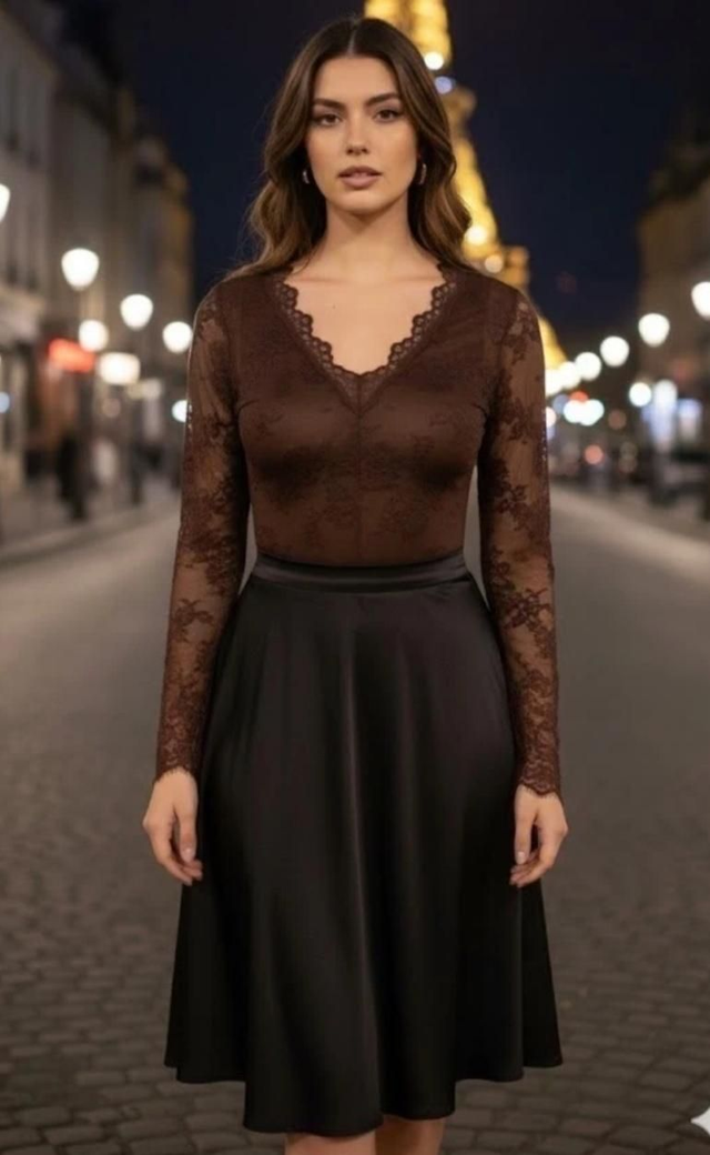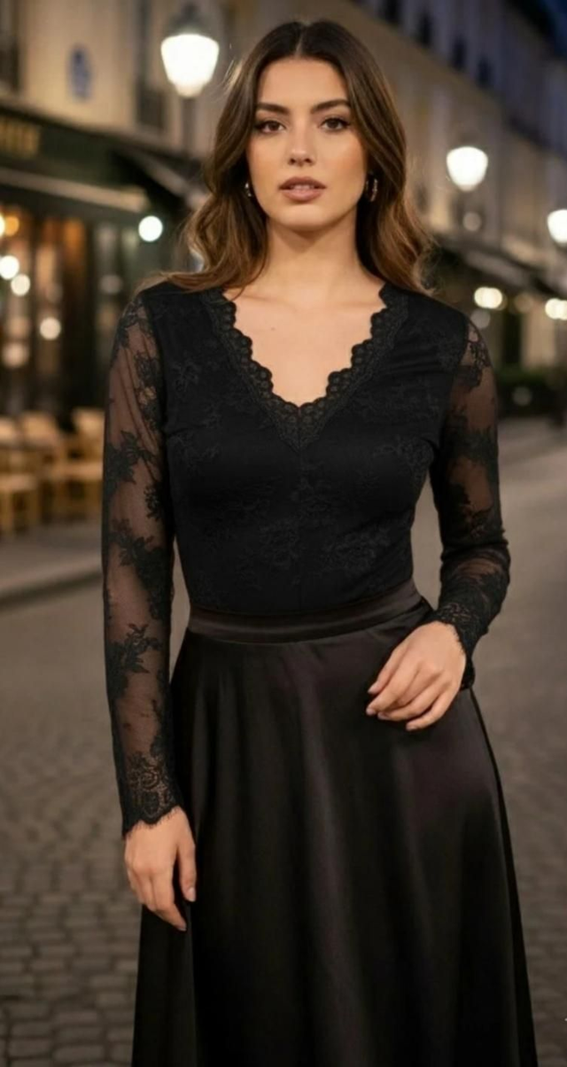 body col V, le devant est doublé en dentelle, les manches en dentelle, et le dos est uni. La mannequin mesure 168 cm et porte du S, qui correspond à un 36.